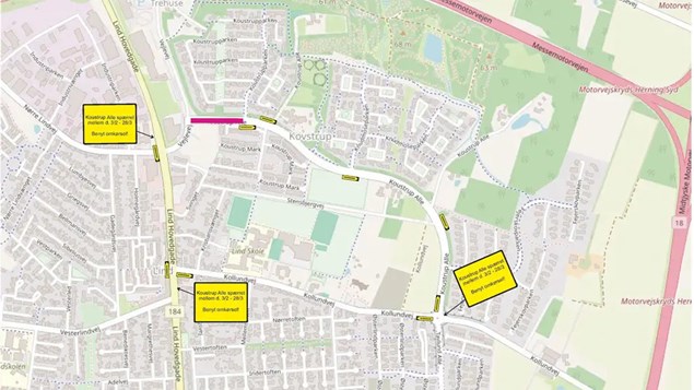Fra torsdag den 6. februar til fredag den 28. marts 2025 vil Koustrup Allé blive spærret for gennemkørsel på grund af nødvendigt gravearbejde. For at sikre trafikken flyder, vil der blive etableret en omkørselsrute via Kollundvej og Lind Hovedgade.